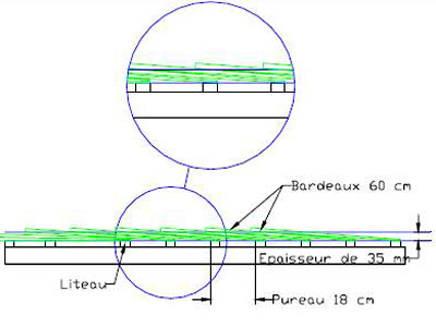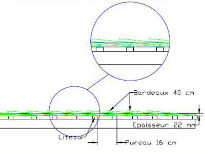 La figure ci-dessous présente une coupe schématique de la couverture bardeau de classement au feu M3 (P.V. CSTB N°RA99241).