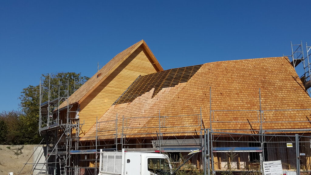 La méthode de pose a suivi toute notre expérience et tiens compte du travail naturel du bois, elle tuile, elle se fend, elle se relève, le but étant de rester étanche… c’est pourquoi nous avons un pureau de 180 mm et un clouage sur le premier pureau. Ainsi, elle reste étanche à long terme.