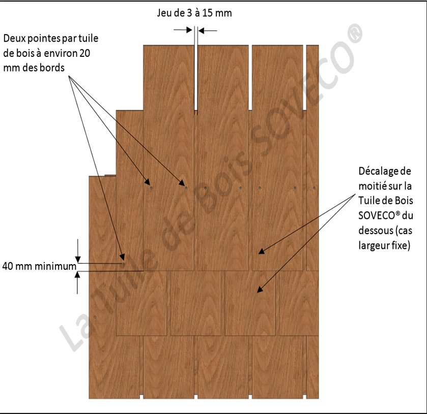Les Tuiles de Bois SOVECO® à largeur fixe sont décalées de moitié sur la tuile du dessous. En revanche dans le cas de Tuiles de Bois SOVECO® à largeur variable, ce décalage n’est pas fixe mais ne peut être inférieur à 20 mm.Un jeu d’environ 3 à 15 mm doit être aménagé dans le joint entre les Tuiles de Bois SOVECO®.